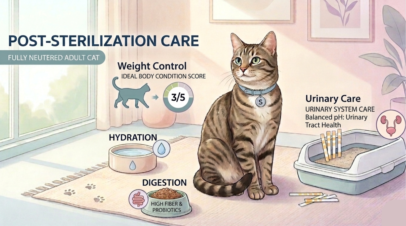 This article is designed as an easy guide for cat owners, covering how to care for a cat after sterilisation, which signs to watch for, and how to choose the right food to support healthy weight management, digestive balance, and urinary tract health in the long term.