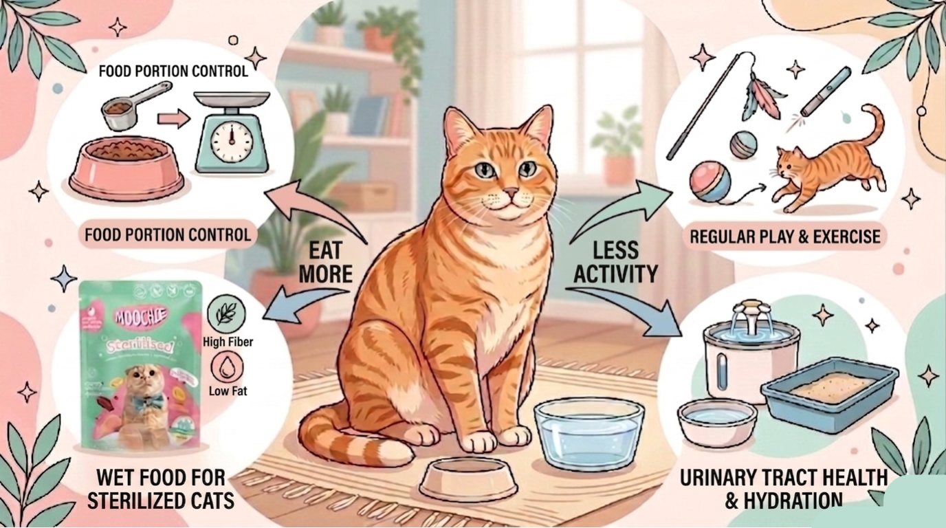 After sterilisation, cats often become more food-motivated, use less energy, and gain weight more easily than before. To keep them healthy, owners should focus on: